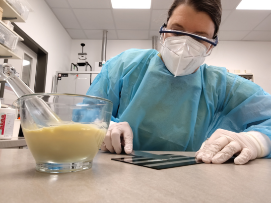 Darin reibt sie die Salicylsäure zunächst mit etwa einem Zehntel der Nichtionischen hydrophilen Creme SR DAC an. Diesen Ansatz ergänzt sie unter häufigem Abschaben nach und nach mit der vorgeschriebenen Menge an Grundlage. Als Inprozessprüfung kontrolliert sie, ob der Ansatz gleichmäßig weiß aussieht und frei von Agglomeraten ist. Zum Schluss gibt sie Steinkohlenteerspiritus DAC in kleinen Portionen zu und verrührt jeweils unter häufigem Abschaben. Als Inprozesskontrolle hält sie fest, dass eine weiche, gleichmäßig hellbraun aussehende Creme entstanden ist.